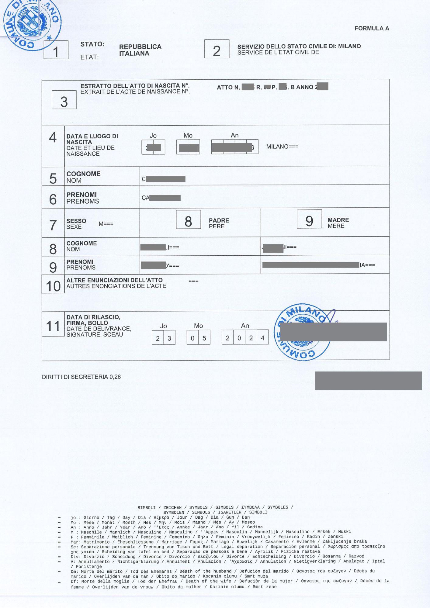 - اصل گواهی ولادت (Certificato di Nascita Internazionale) که نام پدر و مادر در آن ثبت شده باشد. گواهی ولادت حتما باید فرمت اینترنشنال بوده و مهر کمونه (شهرداری) را داشته باشد. نمونه گواهی ولادت بین المللی